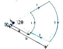 A loop, carrying a current i, lying in the plane of the paper, is in the field of a long straight wire with constant current `i_0` (inward) as shown in fig. Find the torque acting on the loop.