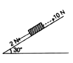 चित्रानुसार एक खुरदरे आनत तल पर एक गुटका रखा है। यदि गुटके पर समतल के समदिशX300 व नीचे की ओर 2ND मान तक का बल लगाया जाता है, तो गुटका स्थिर रहता है। ऐसा बल जब ऊपर की ओर लगाते हैं, तो 10N बल के मान तक गुटका स्थिर रहता है। गुटके व समतल के बीच घर्षण गुणांक का मान होगा- `(g=10 m//s^(2))`
